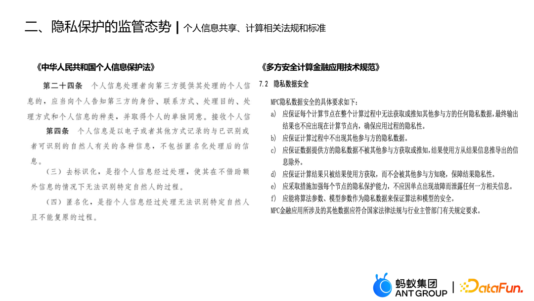 首先,从个保法可以看出,个人信息处理者需要重视用户知情权和授权,并对于用户数据隐私保护的数据处理需要进行去标识化、匿名化等处理。在 2020 年中国人民银行颁布的《多方安全计算金融应用技术规范》中的隐私数据安全章节中,对于隐私数据安全提出了诸多要求,如算法参数、模型参数作为隐私数据进行保护等。