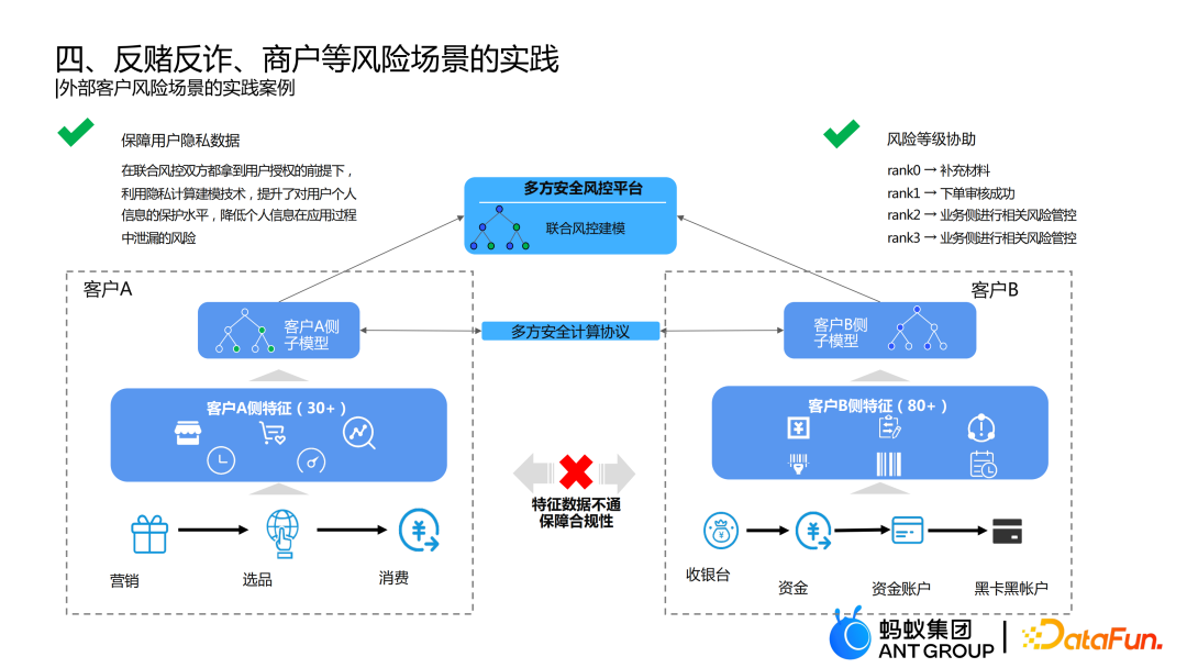 在联合风控双方都拿到用户授权的前提下,我们利用纵向特征相关数据进行联合分析和建模,计算相关用户的风险等级,把风险等级去敏感化,对不同等级对应不同的风险处理方式和手段。同时,通过一些密态保护的能力,保证用户的隐私数据不泄露。