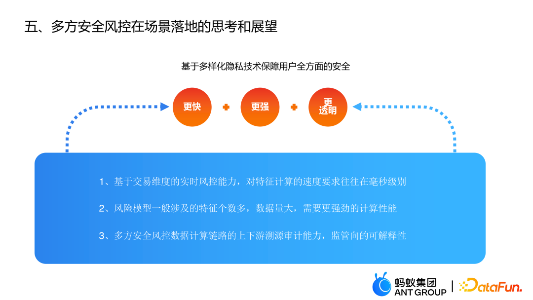 长远来看,多方安全风控在保证高水位隐私安全的前提下,实现更快计算速度、更强计算性能、更透明的面向监管的可解释性,是未来的发展方向。