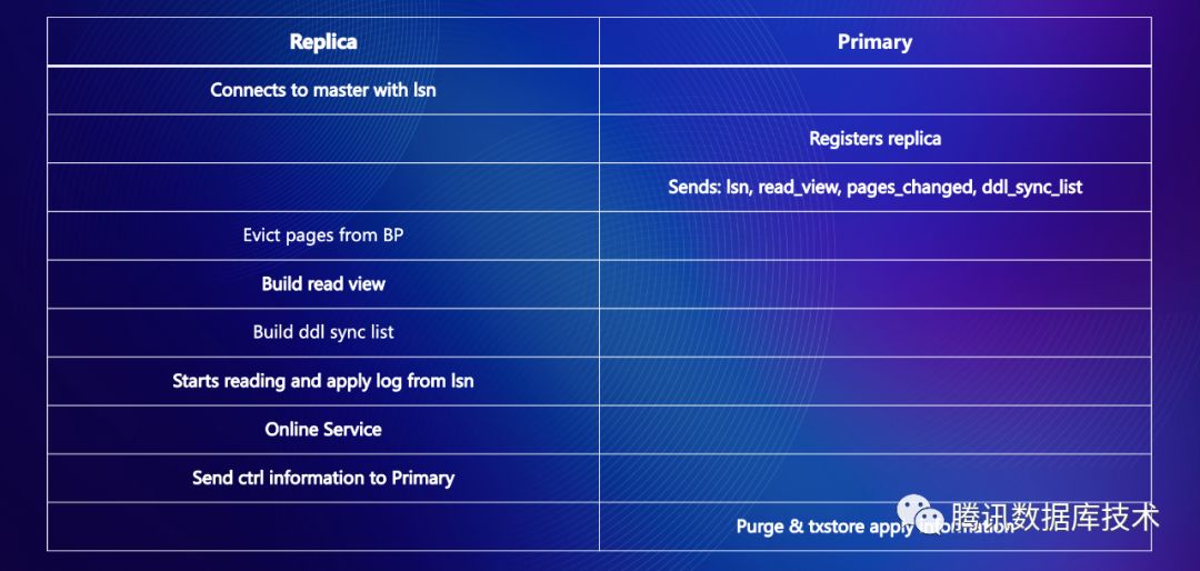 Purge 用来回收空间,即从 undo log 中查找并删除打上 delete mark 的数据,然后回收 undo log 空间本身,该操作只会删除不可能使用到的数据,所以 purge 操作会从 read view 列表中找到一个最老的 read view ,以该 read view 的 low_limit_no 为基准来判断数据是否可以删除。在 CynosDB 中,主库 & 备库使用同一份数据,所以,purge 不仅仅依赖主库最老的 read view,而且依赖所有备库中最老的 read view。只有主库进行 purge 操作,备库不进行 purge 操作。