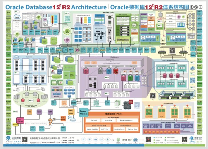 Oracle12.2体系架构图根据最新发布的12.2设计绘制而成,并经过多位ACE专家审核,包含ADG、GSD、Sharding、Flex Cluster、Flex ASM、Multitenant等多个核心模块,覆盖Oracle几乎全部的可选方案。 一张图掌握Oracle 12.2的核心变化,从体系架构到后台进程,从内存结构到存储文件,一览无余。