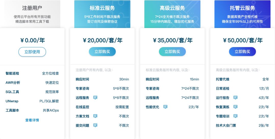 注册后可使用云平台上智能巡检,AWR分析,SQL格式化,SQL审核,PL/SQL解密等多项功能,可下载使用平台上精选的工具脚本