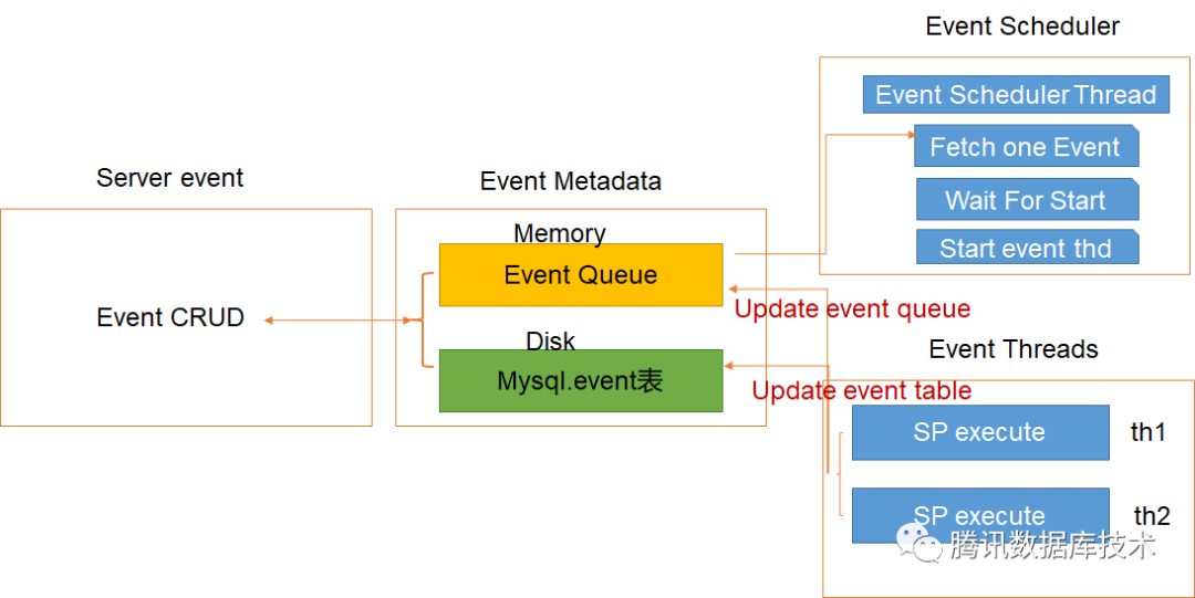 event scheduler线程循环获取event queue队列头的event,并等待任务到时启动event执行线程。event实际是按照存储过程的方式执行的。event执行完成后会更新event的元数据信息。