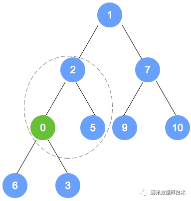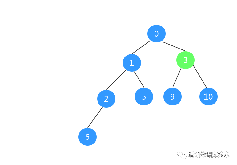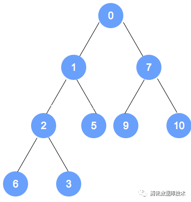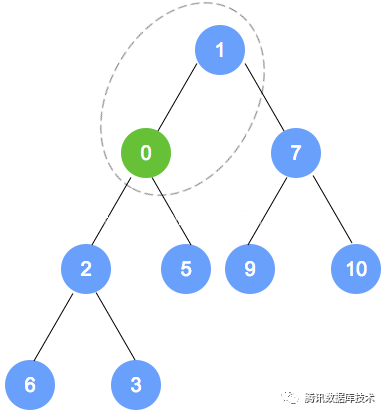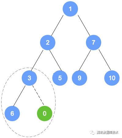 在小顶堆1、2、7、3、5、9、10、6中插入0。step1:将0插入到最后一个节点,并和其父节点3进行比较