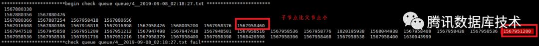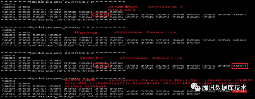 (1) 对这50个任务队列进行解析并检查每个队列是否满足小顶堆的特性。分析发现部分队列不满足小顶堆的特性,而且出错的节点就是用户发现的被延迟的event eventdelayed,如图: