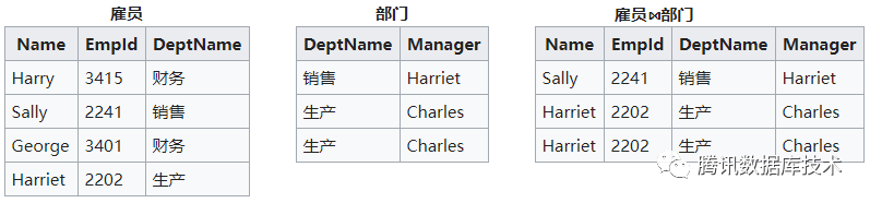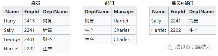 SemiJoin是表上的一个运算。假定R和S是两个表,R SemiJoin S可记为R ⋉ S,结果是在S中满足条件的元组。例如下面的例子是“雇员”和“部门”和它们的半连接的表: