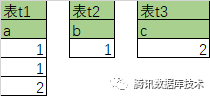 按照扁平化规则后,UNION会导致结果不一致。比如:t1,t2和t3表定义和数据如下: