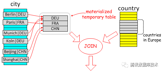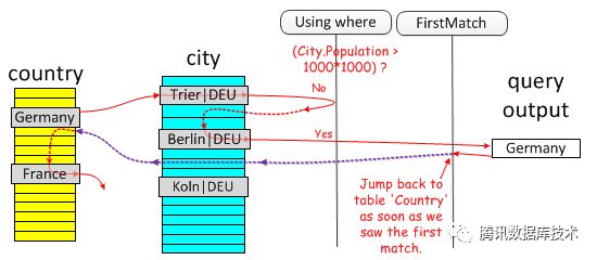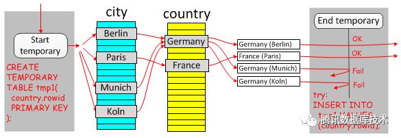 Country与City内连接后有German有三条记录,通过建立临时表,由于临时表的主键是Country表的RowId,重复项将不能插入。具体可以看到,去重过程如下: