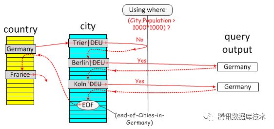 举例,Country InnerJoin City的嵌套循环流程如下,先遍历Country再遍历City:
