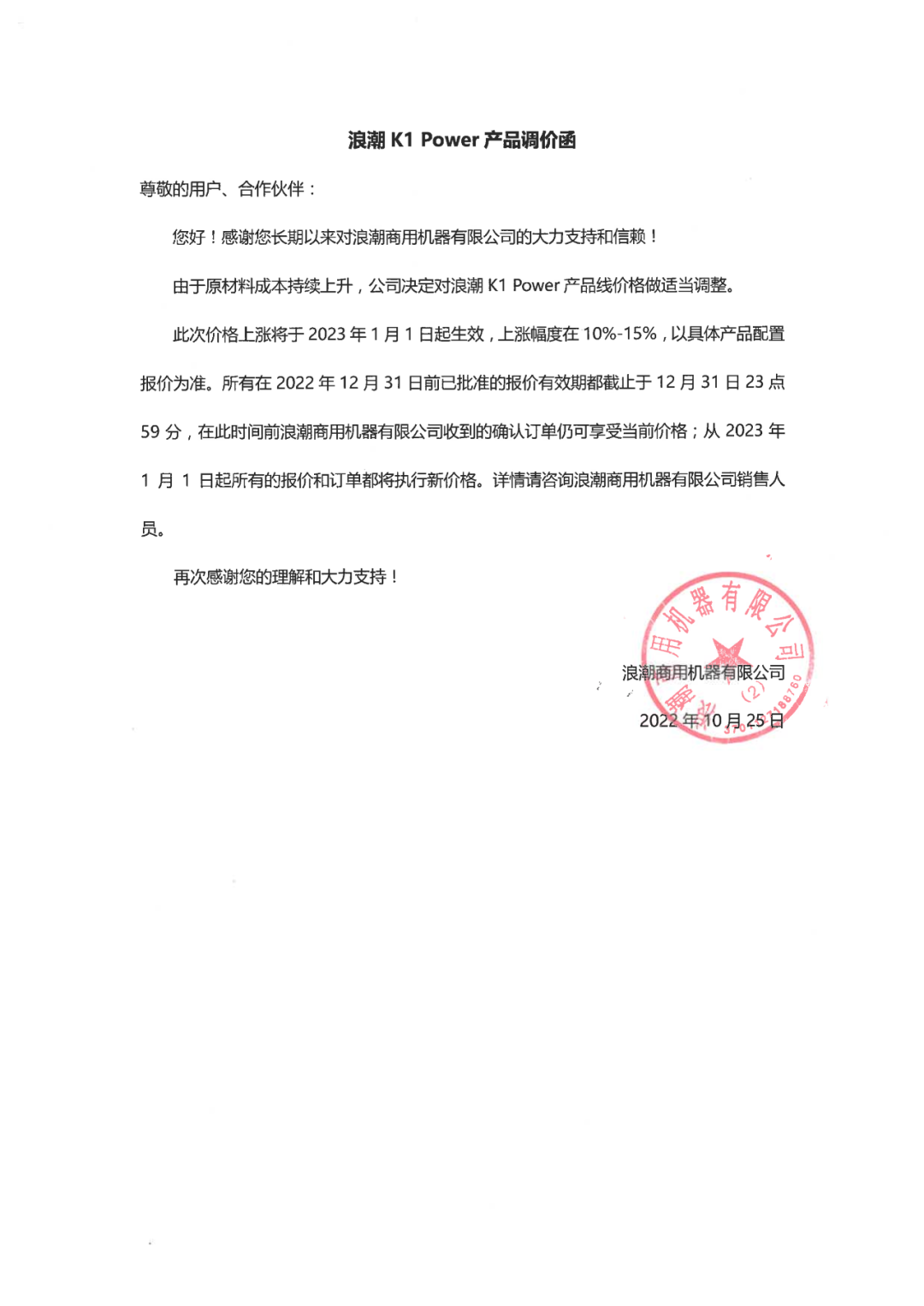 关于浪潮K1 Power产品价格调整的通告