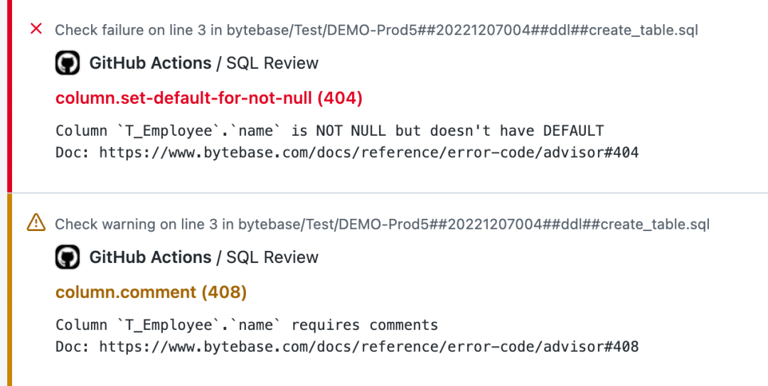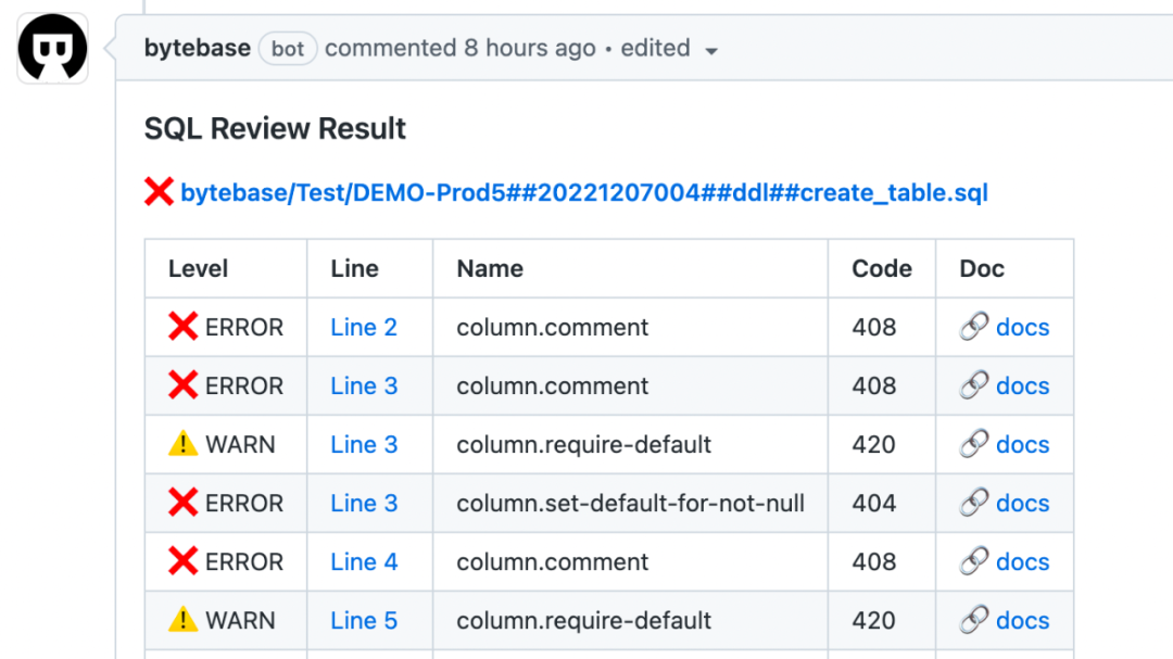 完成配置后,当用户提交的 PR 中检测出 SQL,即可自动触发审核过程,并在被审核的文件中查看详细审核结果。