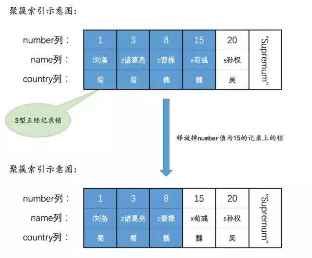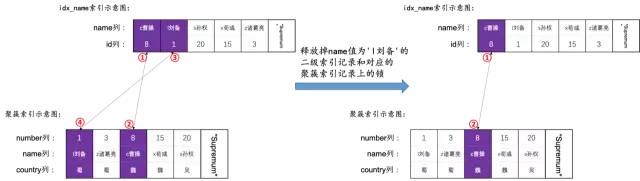 条件,再把该二级索引记录和对应的聚簇索引记录上的锁释放掉。这个过程如下图所示: