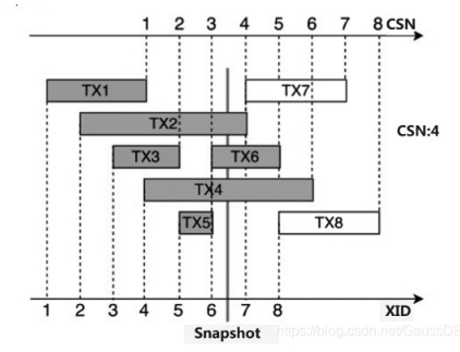 因此当一个事务拿到的快照为 CSN=3时,事务 TX2、TX4、TX6、TX7、TX8的CSN 分别为4、6、5、7、8,对于该事务的快照而言,这几个事务的修改都不可见。