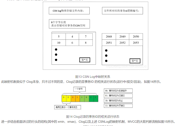 元组的事务状态区中是待提交状态,需要等待提交。CSN 本身与xid也会留存一个映射关系,以便将事务本身及其对应的可见性进行关联,这个映射关系会留存在 CSN Log中,如图13所示。