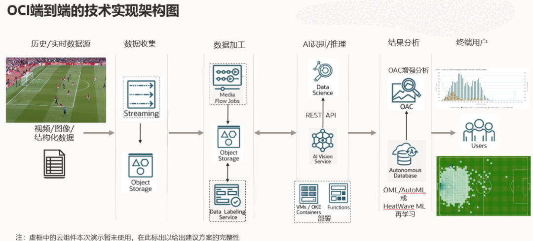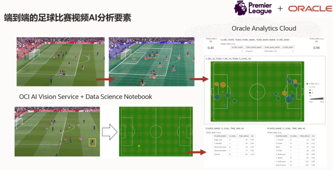 这个示例中,我们看到用户可以在OCI云平台上简便快速的搭建英超足球比赛视频分析系统,通过预先部署的无服务器深度学习模型识别赛场信息,将非结构化数据转化为结构化数据进行分析展示,为专业人士提供决策支持。