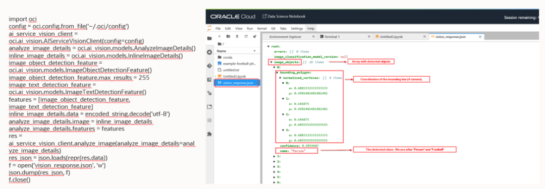 由于比赛视频由大量图像帧组成,因此我们随后需要使用OCI数据科学笔记本调用OCI Vision REST API批量实现赛场对象和球员号码识别,同时将AI识别到的球员和球衣号码关联到一起:
