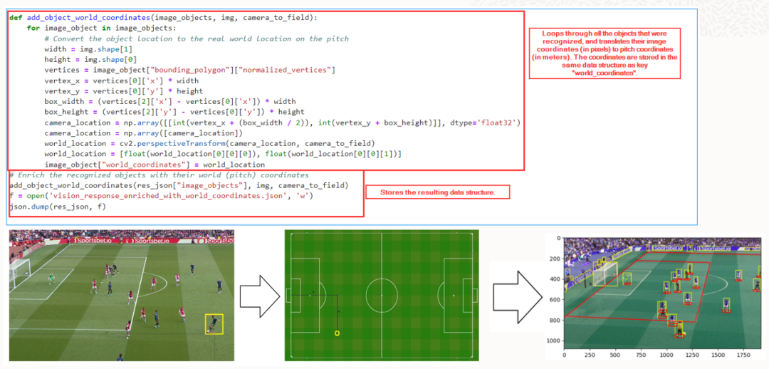 为了统一进行球员位置的分析,我们还需要将AI识别的每一帧图像坐标转换为标准足球场坐标以备分析: