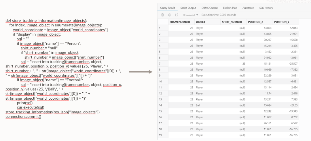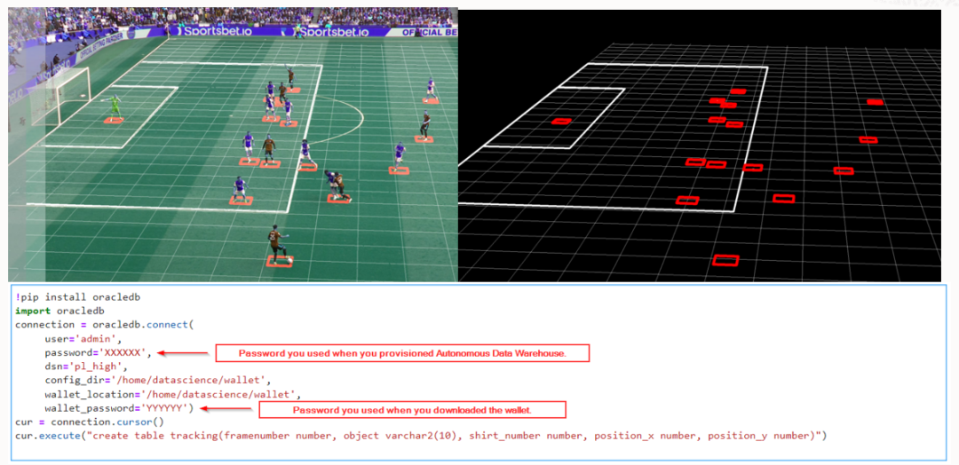 一旦我们有了球员跟踪信息,我们就可以从中提取各种统计数据。例如,球探可能想要计算球员表现的统计数据。教练可能想查看预期目标等。为了让球探和教练等分析师能够轻松访问数据进行分析,我们会将从视频中提取的所有信息存储到自治数据仓库中: