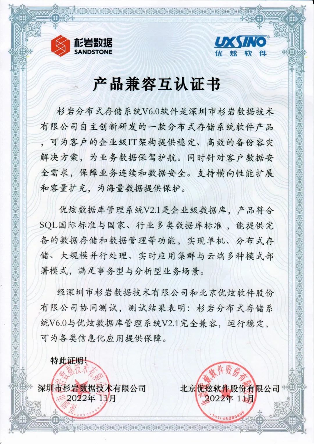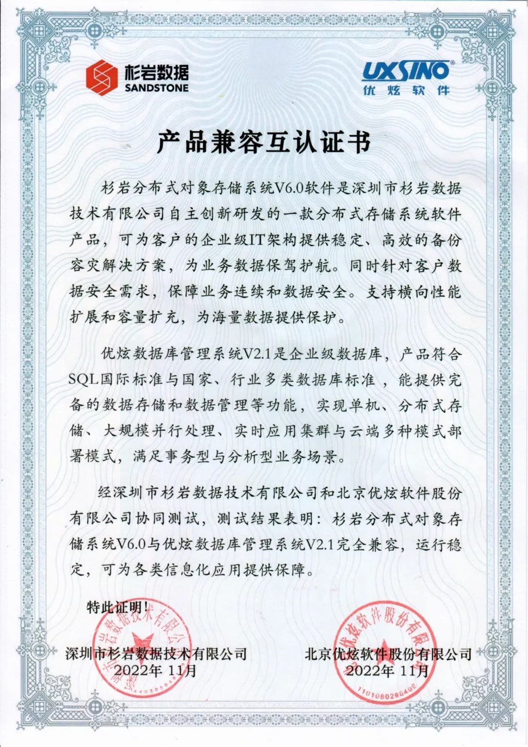 日前,优炫软件与杉岩数据完成产品兼容互认证。本次兼容性互认证经优炫软件与杉岩数据联合测试得出:优炫数据库管理系统与杉岩分布式存储系统、杉岩分布式对象存储系统相互兼容,功能稳定运行,产品体验良好,能够满足用户的海量数据多样化应用需求,为用户提供安全稳定的数字化转型服务。