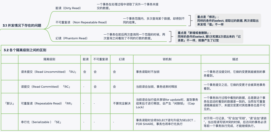 本文以 MySQL 5.7 版本为例进行说明,开始前让我们先简单复习一下 InnoDB 引擎下的四种隔离级别与三种并发场景下存在的问题,内容如下: