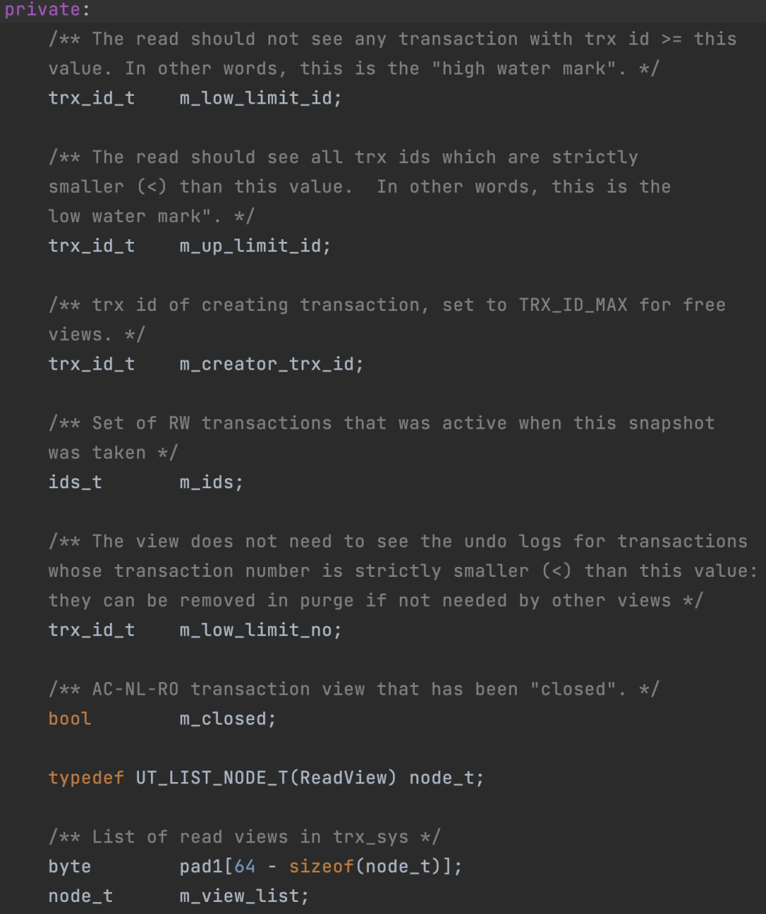 下面来看一下,在 MySQL 5.7 的源码中,对于 MVCC read view 结构是如何定义的: