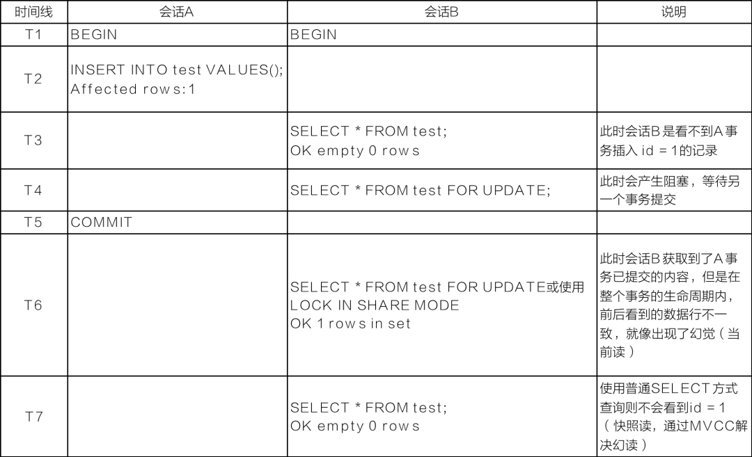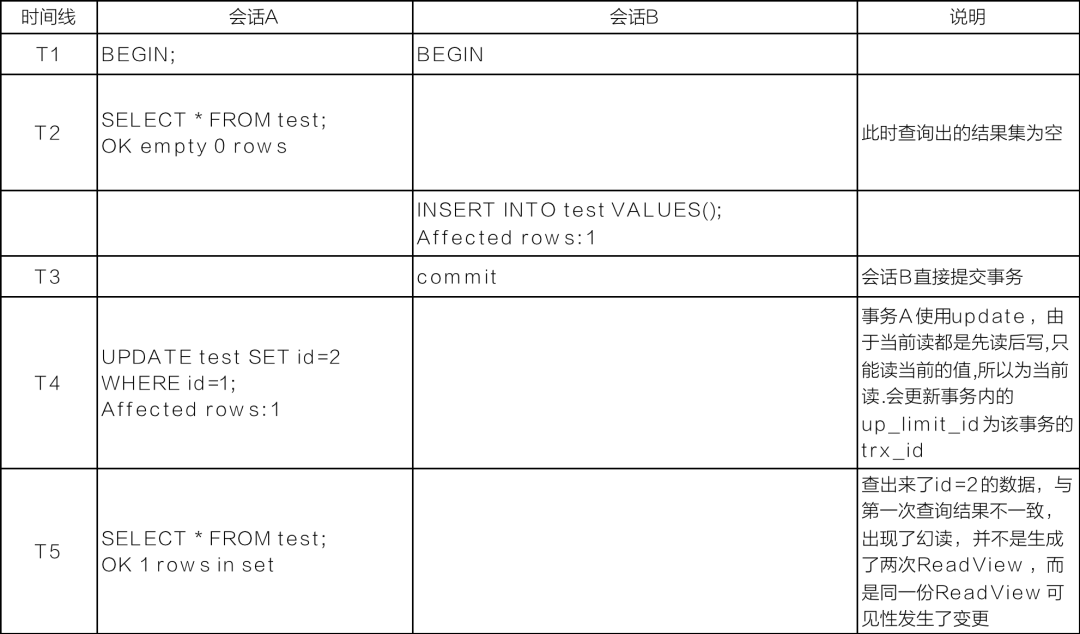 在 RR 级别下普通查询是快照读,并不会看到其他事务插入的数据。这种幻读情况只有在快照读与当前读混合使用的情况下才会出现,这部分也是争议比较多的地方。