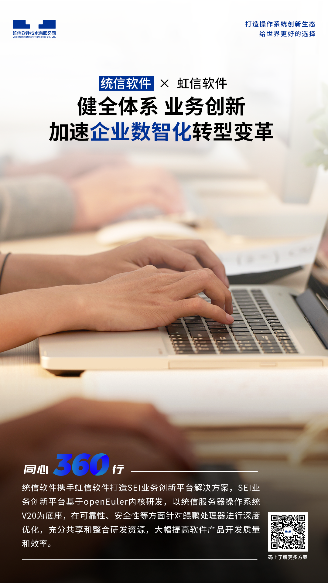 肩负企业数字化转型的使命与担当,统信软件携手虹信软件打造SEI业务创新平台解决方案,基于openEuler内核研发,以统信服务器操作系统V20为底座,在可靠性、安全性等方面针对鲲鹏处理器进行深度优化,充分共享和整合研发资源,大幅提高软件产品开发质量和效率。