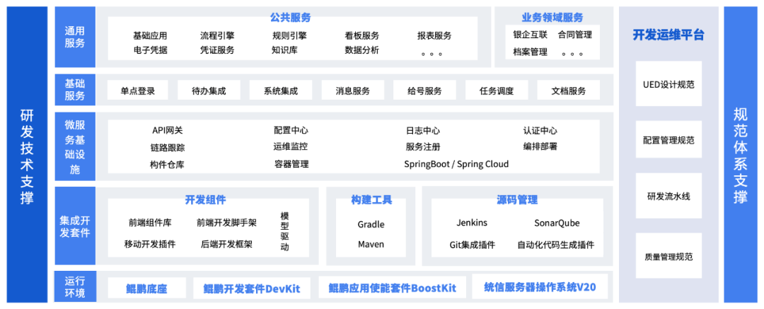 以统一开发框架为基础,规范体系为支撑,打造一款开放的有较强适应性、集成能力的企业技术底座;