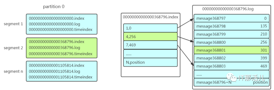 1)先找到offset的368801message所在的segment文件(利用二分法查找),这里找到的就是在第二个segment文件。 2)打开找到的segment中的.index文件(也就是368796.index文件,该文件起始偏移量为368796+1,我们要查找的offset为368801的message在该index内的偏移量为368796+5=368801,所以这里要查找的相对offset为5)。由于该文件采用的是稀疏索引的方式存储着相对offset及对应message物理偏移量的关系,所以直接找相对offset为5的索引找不到,这里同样利用二分法查找相对offset小于或者等于指定的相对offset的索引条目中最大的那个相对offset,所以找到的是相对offset为4的这个索引。 3)根据找到的相对offset为4的索引确定message存储的物理偏移位置为256。打开数据文件,从位置为256的那个地方开始顺序扫描直到找到offset为368801的那条Message。