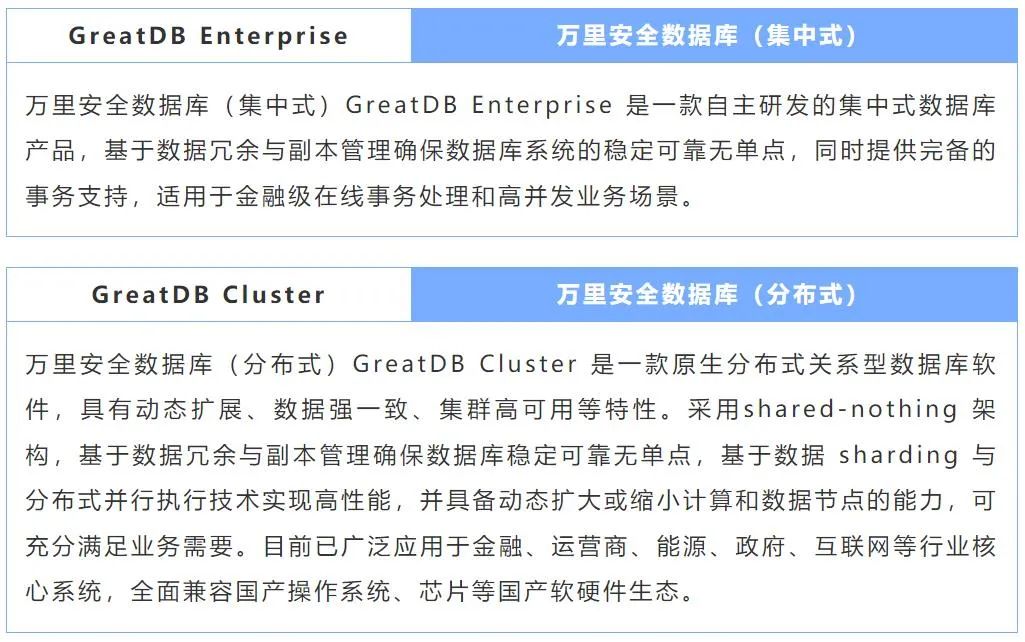万里安全数据库软件GreatDB是公司自主研发的核心关系型数据库产品,可根据用户需求采用集中式或分布式部署。产品具备动态扩展、数据强一致、集群高可用等众多企业级特性,并提供丰富的安全功能特性,满足业务高并发、高扩展性、高安全性等需求,目前已广泛应用于金融、能源、运营商、政府等领域,可充分满足用户数据安全、产品可控等国产化需求。
