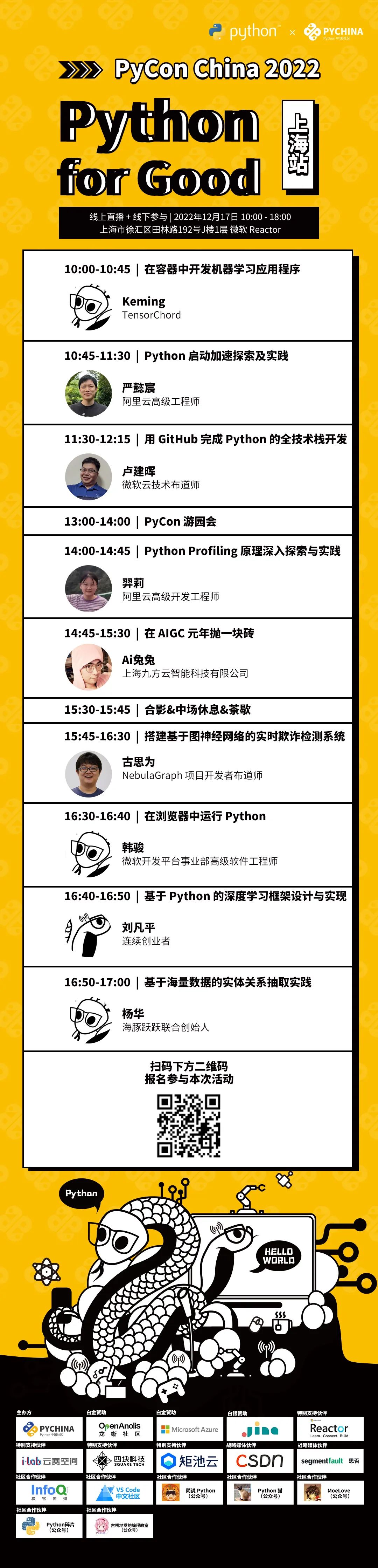 PyCon China 是由 PyChina 社区每年定期举办的技术交流会,现如今已成为中国大型的 Python 技术会议。PyCon 希望汇聚更多的开发者们,一起交流 Python 技术,包括人工智能、Python 特性、网络安全、服务端开发、运维、医疗、金融、开源项目等更多 Python 相关的技术领域。