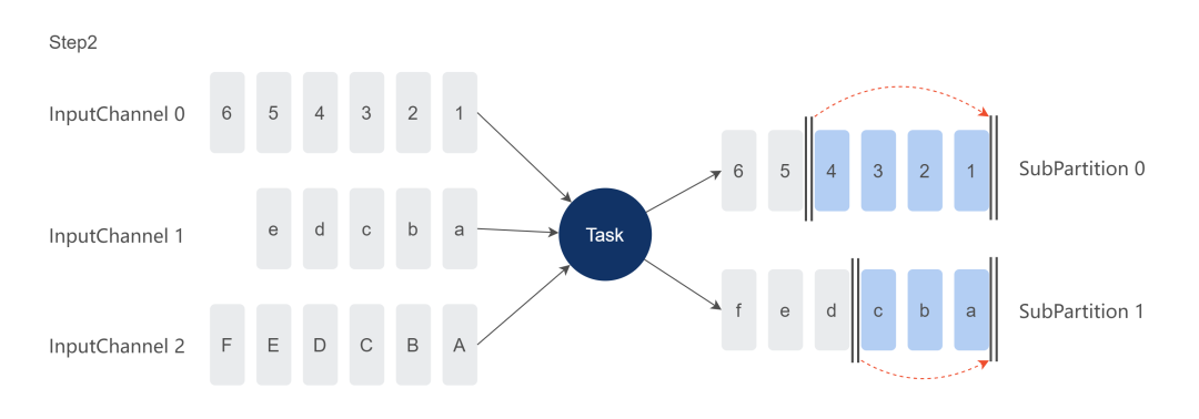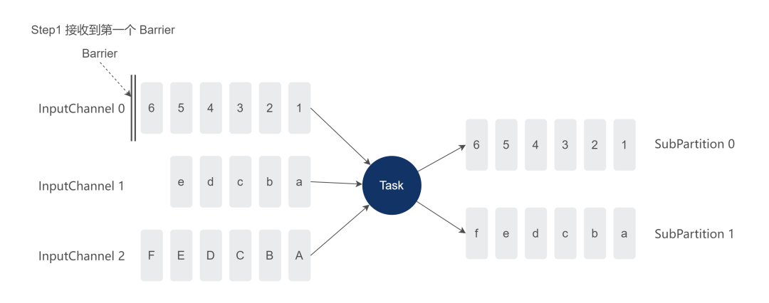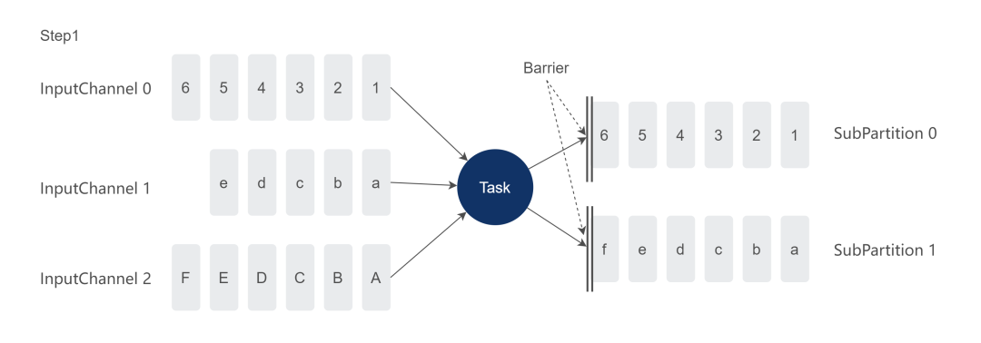 假设当前 Task 上游 Task 并行度为 3,下游并行度为 2。UC 开始后 Task 的 3 个 InputChannel 会陆续收到上游发送的 Barrier。如图所示,灰色框表示 buffer 中的一条条数据,InputChannel-0 先收到 Barrier,其他 InputChannel 还没收到 Barrier。