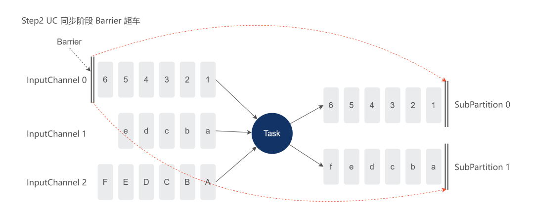 当某一个 InputChannel 接收到 Barrier 时,会直接开启 UC 的第一阶段,即:UC 同步阶段。注意:- 只要有任意一个 Barrier 进入 Task 网络层的输入缓冲区,Task 直接开始 UC;