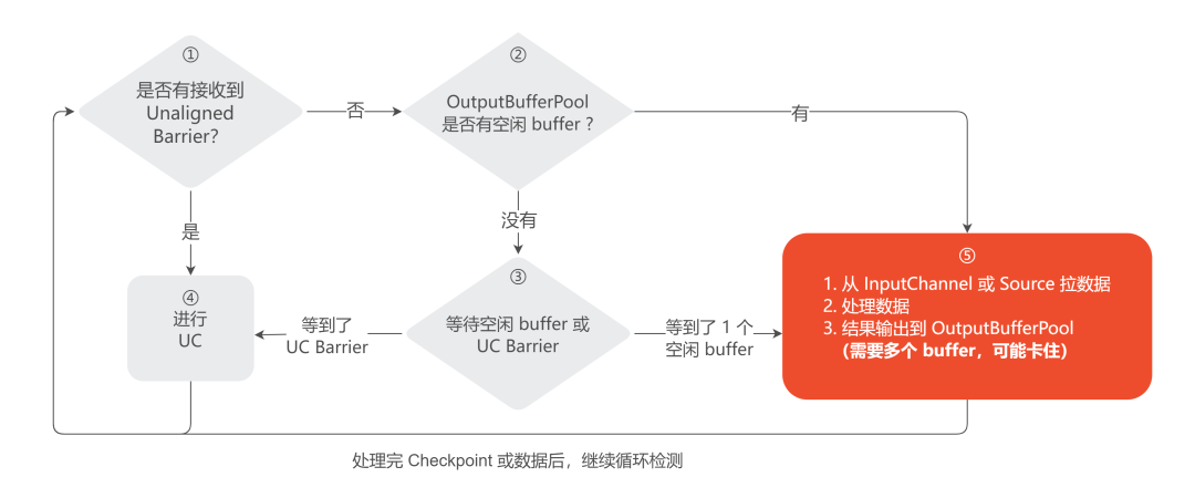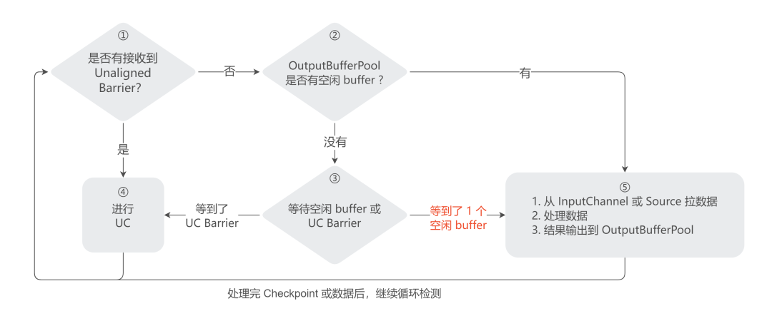 - 非 SourceTask 从 InputChannel 读数据之前会对 OutputBufferPool 进行检查,有空闲 buffer 才会读取。SourceTask 从外部组件读取数据前如果不检查 OutputBufferPool 是否有空闲 buffer,则 UC 会表现不佳。