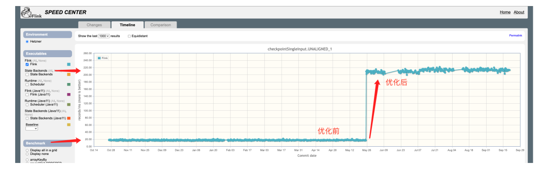 社区早期为 Checkpoint 设计了 Benchmark 用来评估 Checkpoint 的性能,如下图所示,该优化 merge 到 Flink master 分支后 UC 的性能提升了 11 倍[12] 。