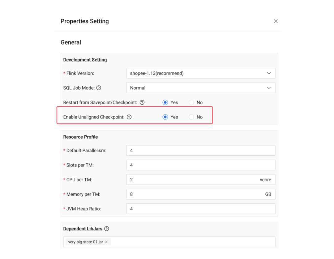 为了规避 UC 带来的额外风险,Shopee 内部将 aligned-checkpoint-timeout 设置为 1 分钟,表示任务反压不严重,如果 AC 可以在 1 分钟以内完成,则使用 AC。当反压严重 AC 在 1 分钟以内不能完成时,才切换为 UC。Shopee Flink 平台的开发页面也增加了 UC 的开关,用户可以选择是否为作业开启 Unaligned Checkpoint,目前已有上百个 Flink 任务开启 UC,且目前使用 UC 的作业表现良好,反压时 UC 也可以成功。