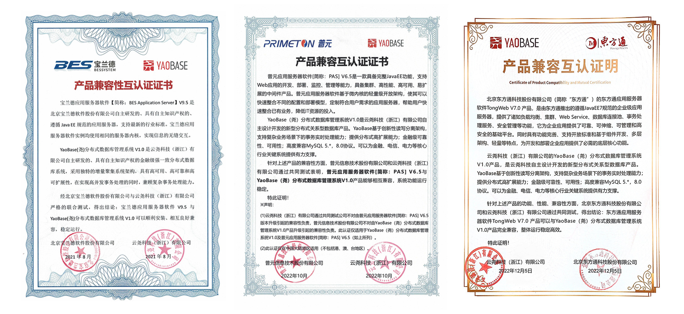 近日,YaoBase(尧)分布式数据库与宝兰德、普元、东方通国产中间件软件近日完成产品兼容性互证。经过严格的测试,双方产品完全兼容,整体运行稳定,在兼容性、功能和性能方面表现良好。