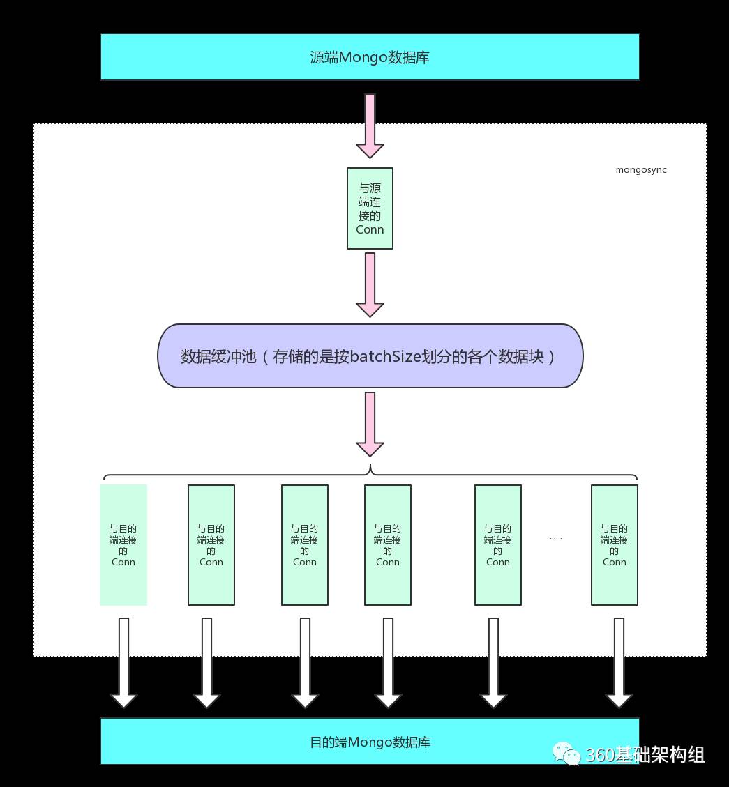 —bg_num参数用于指定启动多少个线程往目标数据库写入数据。经大量测试发现全量同步整个数据传输过程中,往目标端的写入速度是mongosync最大的瓶颈。因此这里我们采用多线程(每个线程与目的端建立一个连接)并发写入机制来提升数据传输速度,具体原理见下图: