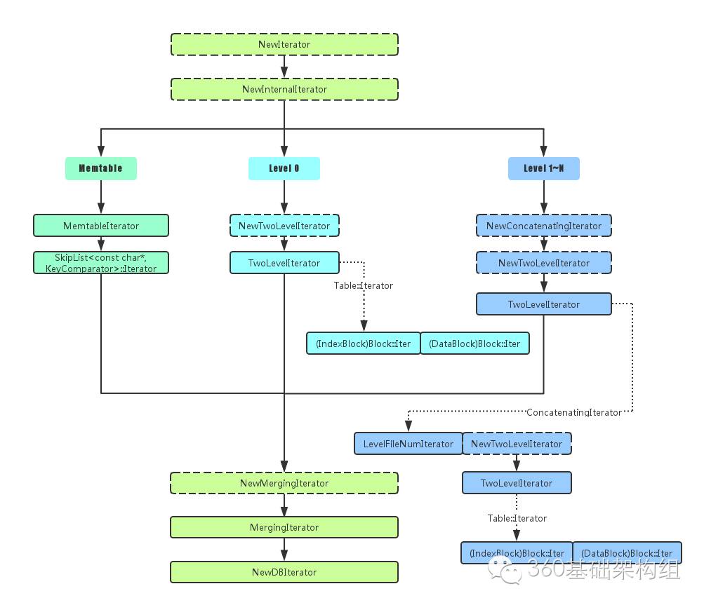 首先给出leveldb中主要Iterator的关系图,这个图是当用户调用NewIterator接口后的过程图,其中虚线方块是调用接口名,实线方块则是各个Iterator了,先粗略看一下,结合下面的讲述,再回过头来看这个图就能有更深的理解: