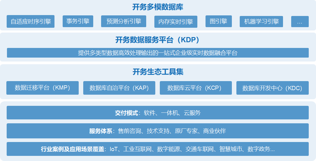 从 KaiwuDB 的产品全景图可以看出,其产品定位为下一代互联网、物联网和工业互联网的数据管理基础设施。截至目前,KaiwuDB 产品体系囊括自主研发多模数据库 -- KaiwuDB 及数据服务平台等,未来将能够为包括 IoT、工业互联网、数字能源、交通车联网、数字政务等不同行业提供更多数字赋能。