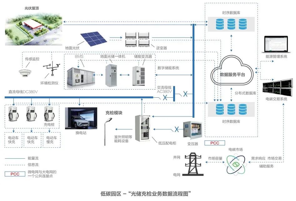 以低碳园区为例,KaiwuDB 依托能源计算、分布式存储、AIoT、区块链、大数据、云计算等技术,结合光伏等新能源产业发展契机,打造园区分布式光 - 储 - 充 - 检体系,为园区源网 - 荷 - 储以及能耗、碳排放的监控业务构建数字能源管理体系,推动园区向绿色、低碳、安全、高效转型。