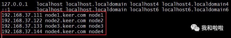 1192.168.37.111 node1.keer.com node1192.168.37.122 node2.keer.com node2192.168.37.133 node3.keer.com node3192.168.37.144 node4.keer.com node4