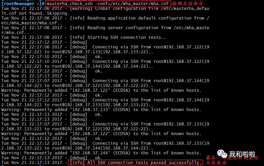 1[root@manager ~]# masterha_check_ssh -conf=/etc/mha_master/mha.cnf