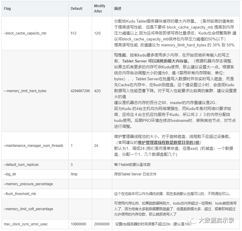 Tablet Server能使用的最大内存量,tablet Server在批量写入数据时并非实时写入磁盘,而是先Cache在内存中,在flush到磁盘。这个值设置过小时,会造成Kudu数据写入性能显著下降。对于写入性能要求比较高的集群,建议设置更大的值 :
