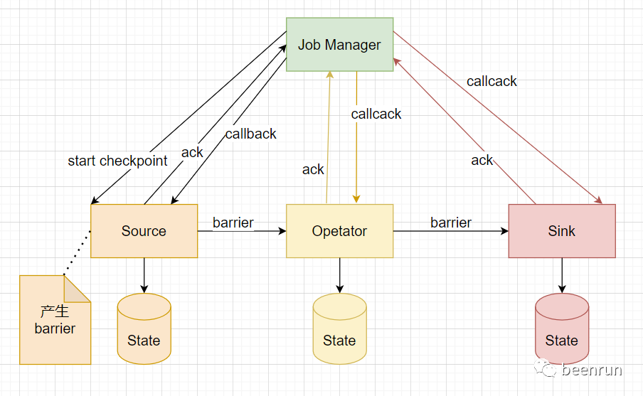 (1)JobManager的Checkpoint Coordinator会定期向每个source subtask发送命令,start checkkpoint,触发checkpoint(trigger checkpoint)