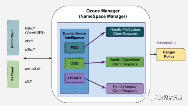 以下是 Ozone 如何管理其元数据命名空间并根据存储桶类型处理来自不同工作负载的客户端请求的快速概述。此外,bucket 类型的概念在架构上以可扩展的方式设计,以支持未来的 NFS、CSI 等多协议。