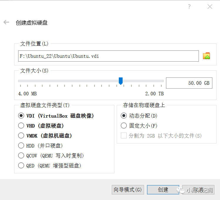 创建虚拟磁盘,并且设置虚拟磁盘文件类型为VDI文件类型,存储选择动态分配即可,调整文件大小为50GB,具体可以参考下图