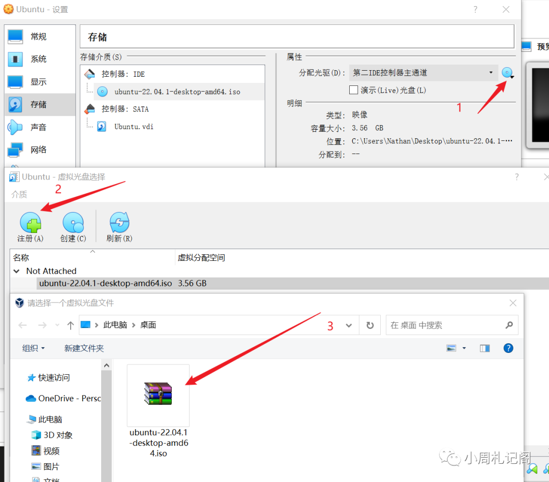 选择光驱,点击注册添加下载完成的Ubuntu系统镜像ISO文件,具体操作可以参考下图。