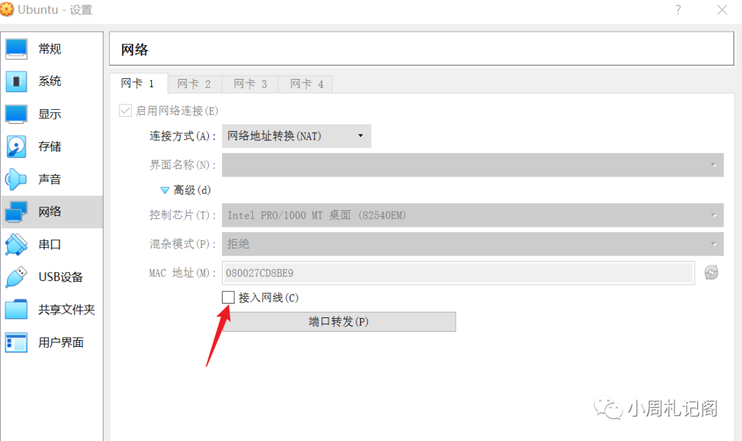 进入设置中将网络选项中高级菜单栏中将接入网线功能取消勾选。(在系统安装好后虚拟机系统需要联网需要重新勾选方能联网使用)。