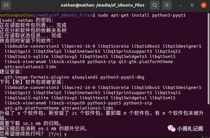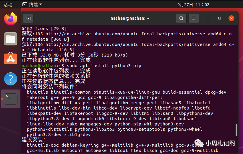 使用sudo apt install python3-pip进行pip安装,如遇到安装包位置无法定位可以翻阅问题及解决办法章节。在命令执行时键盘输入y继续下载安装,随后等待下载解压安装即可。